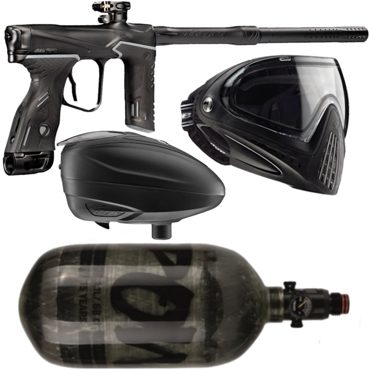 Set completo de paintball para deportes de competición, compuesto por el DYE MXR, el cargador DYE LT-R, un sistema HP compuesto ligero con una presión de llenado de 300 bar y una máscara DYE i4.