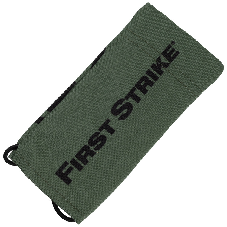 Calcetines para correr de paintball First Strike con letras del logotipo en un lado y el logotipo de First Strike en el otro lado.