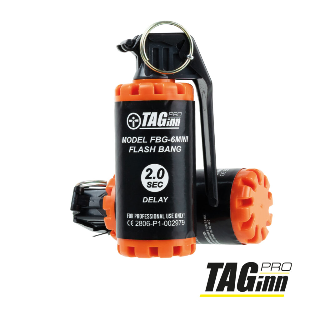 ¡Por fin llegó! Ya tenemos en stock la nueva granada aturdidora compacta TAGINN. El nuevo modelo se llama FBG-6 Mini. Es tan pequeña y compacta como la FBG-4, pero tan potente y ruidosa como la FBG-6. El empaque naranja advierte sobre el intenso destello y la explosión. Disponible ahora. Cómprelas individualmente o en un práctico paquete de 6 para hombres.